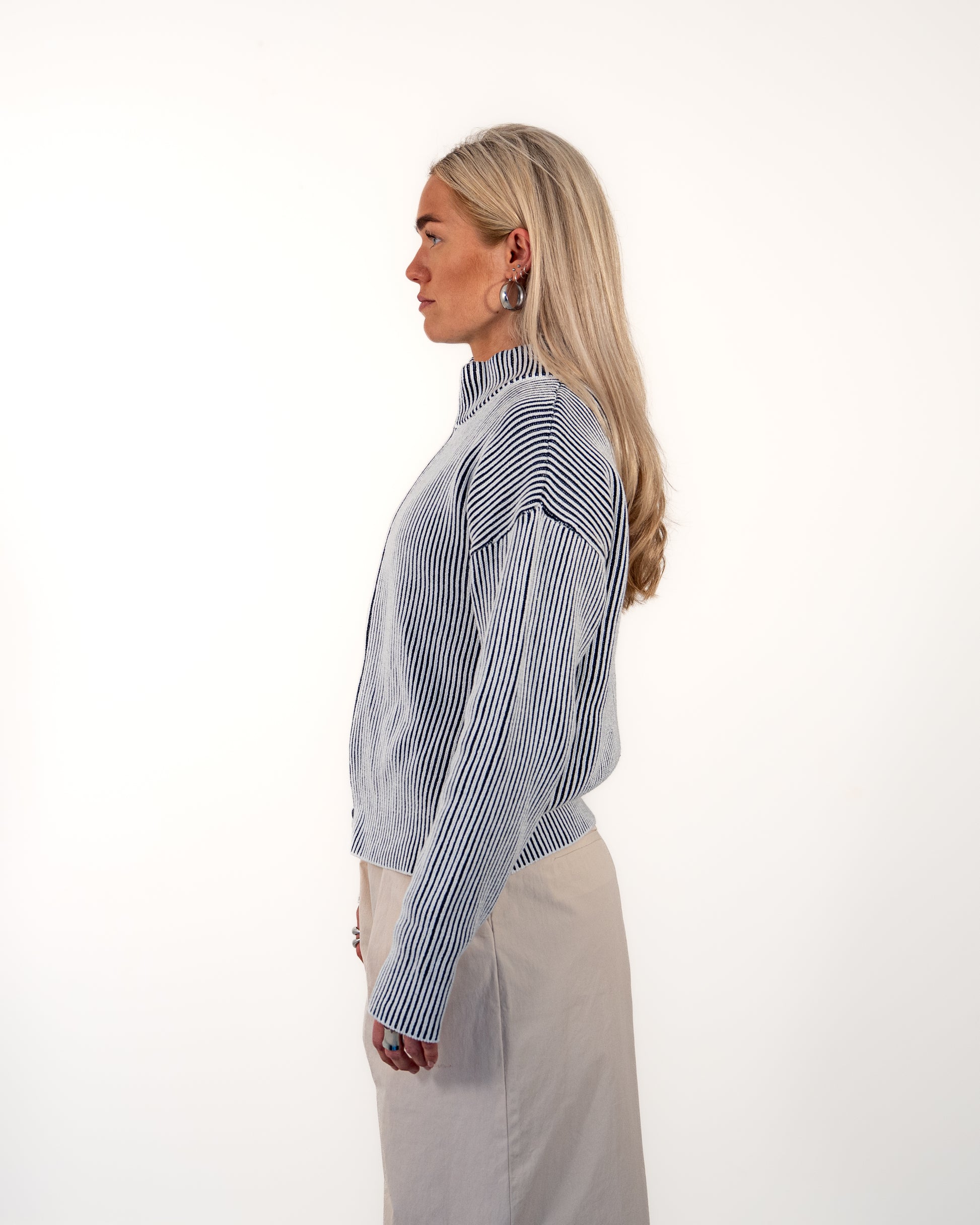 Double-zip knitwear in a clean two-tone design, combining white and navy blue. Made in a medium-weight knit with a structured yet comfortable feel. Finished with a boxy, slightly cropped fit for a modern silhouette, designed for versatile everyday wear.